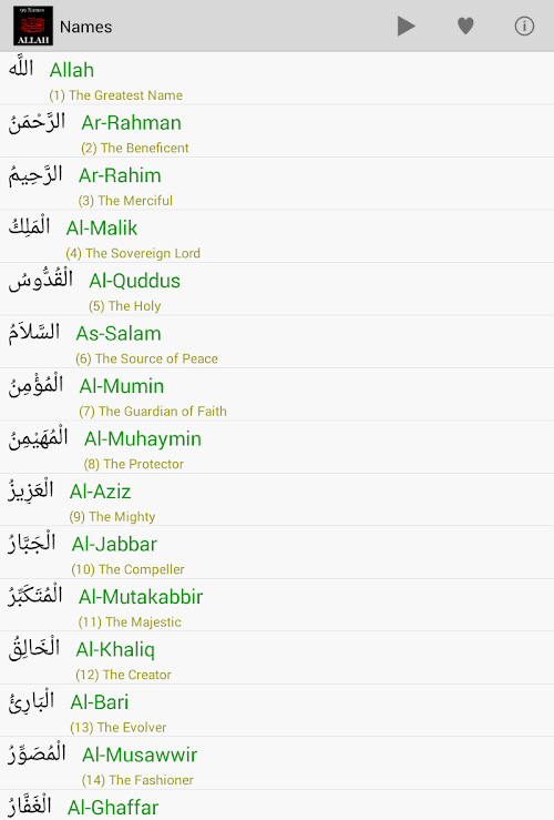 The 99 Names of Allah in Arabic and romanized English, with the English translation. Each name includes information stating the blessings that may be received by reciting the name.