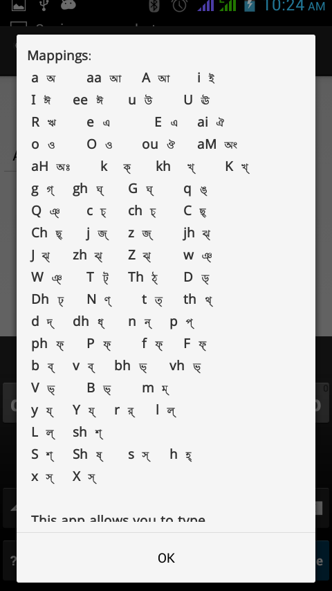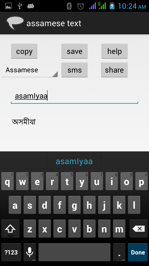 This app allows to type text in assamese or assamiya and other indian languages using normal keyboard.