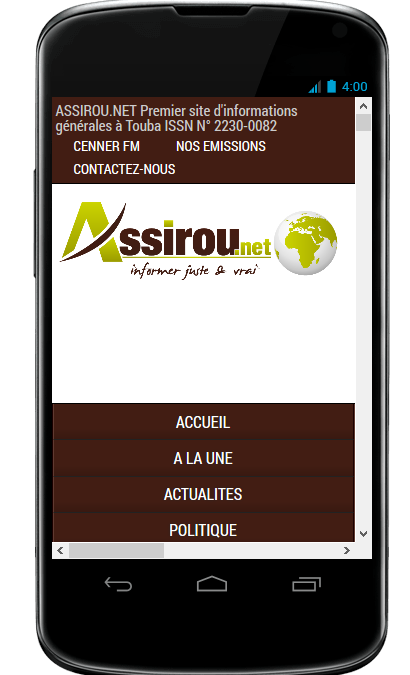 The implementation assirou.net offers an enriched version of its site. Every day from Monday to Sunday follow all news from Senegal and the world over with assirou.net application. It is the best information to Senegal and reference the web.