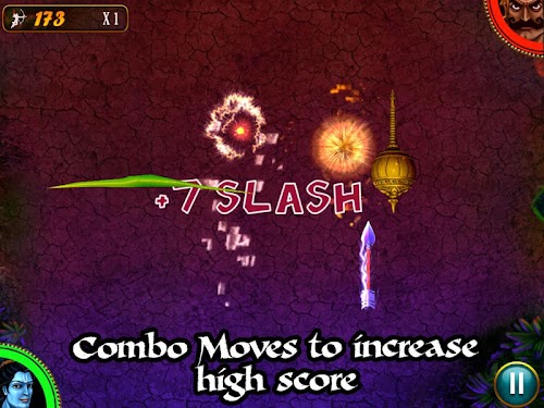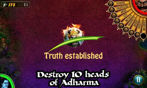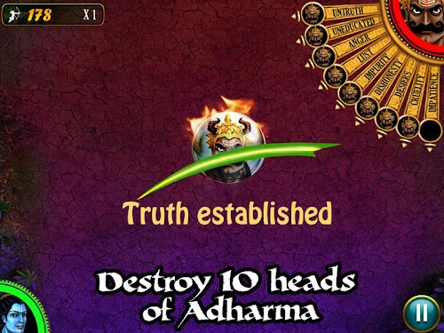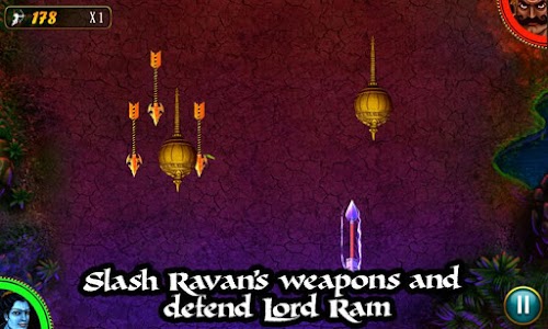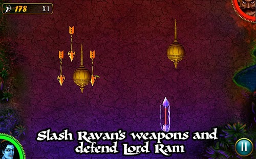 Slash all weapons of Ravan coming towards Lord Ram while you avoid slashing Ram’s weapons. Every head of Ravan defeated unfolds a new challenge and introduces a new weapon to be slashed.