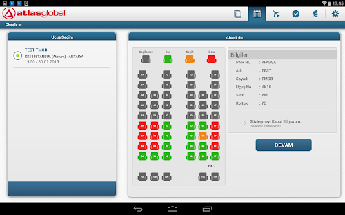 e) Check-in işleminizi yapmadıysanız, uçuş bilgilerinizi içeren 2D kiosk barkodunuzu Android ekranınızda açarak, havalimanlarındaki AtlasGlobal kiosklarından koltuk yerinizi ayırabilir ve biniş kartınızı alabilirsiniz.
