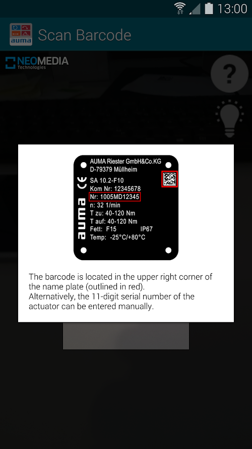 Please scan the DataMatrix code on the name plate or enter the serial number of the actuator. You can download the operation instructions, the technical data sheet and the wiring diagram pertaining to your actuator.