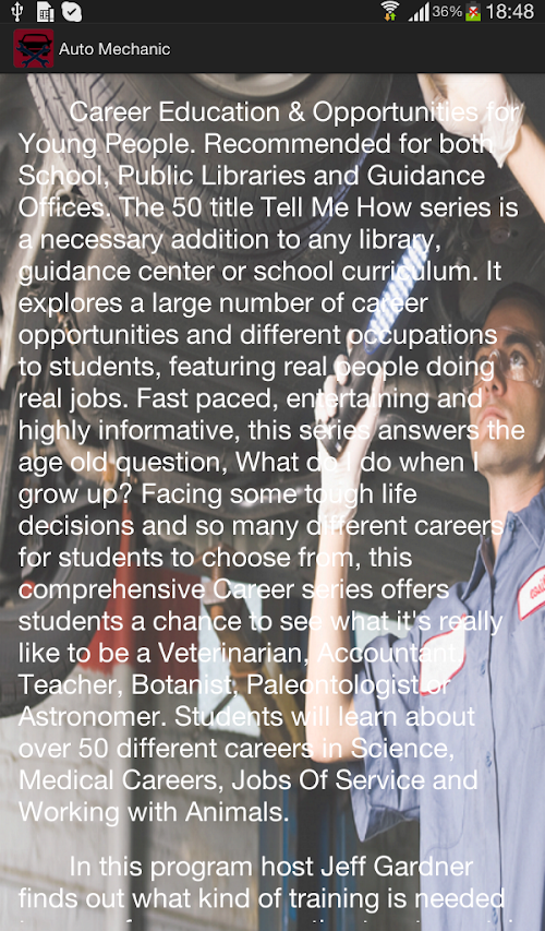In this app host Jeff Gardner finds out what kind of training is needed to move from an apprentice to a top-notch auto mechanic. He learns about the challenges faced by auto mechanics, including the use of computers in today's automobiles. Subjects Covered Include: What does it take to be an auto mechanic? What is an apprenticeship? Why do cars have computers in them? Is being an auto mechanic hard work? Do auto mechanics have their own tools? Is being an auto mechanic dangerous? Can auto mechanics specialize in certain types of repairs? What schooling is necessary to be an auto mechanic? Can girls become auto mechanics? What is a certified auto mechanic?