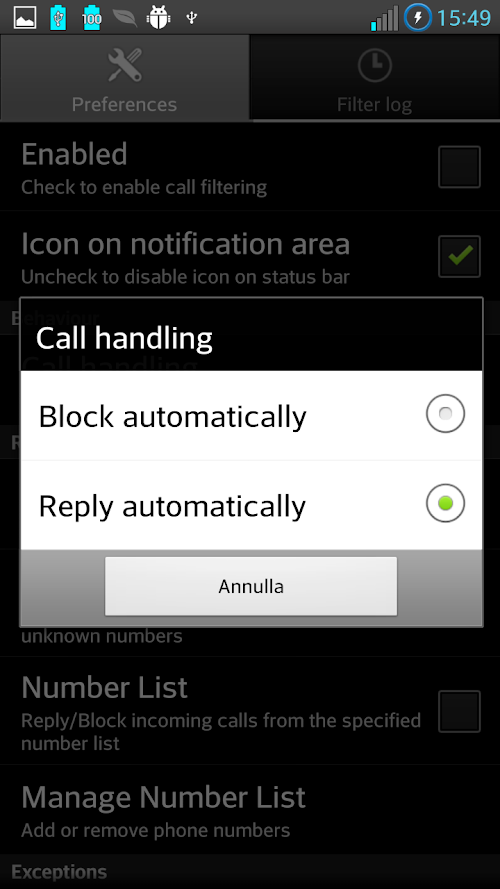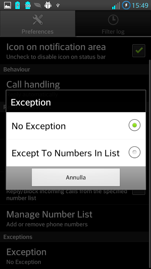 A further feature of this application is the ability to add exceptions, function very useful when we need, for example, to answer or not answer all incoming calls except a few.
