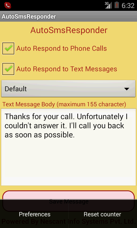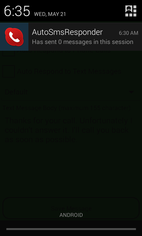 AutoSmsResponder sends text messages to your callers, if you can't answer the phone.