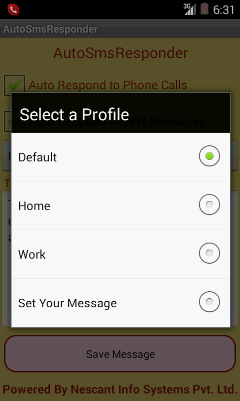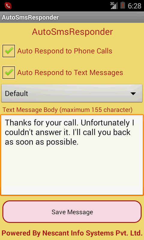 You can also set different messages for different occasions (at Home,Work, ...etc.) Now it replies to texts messages.
