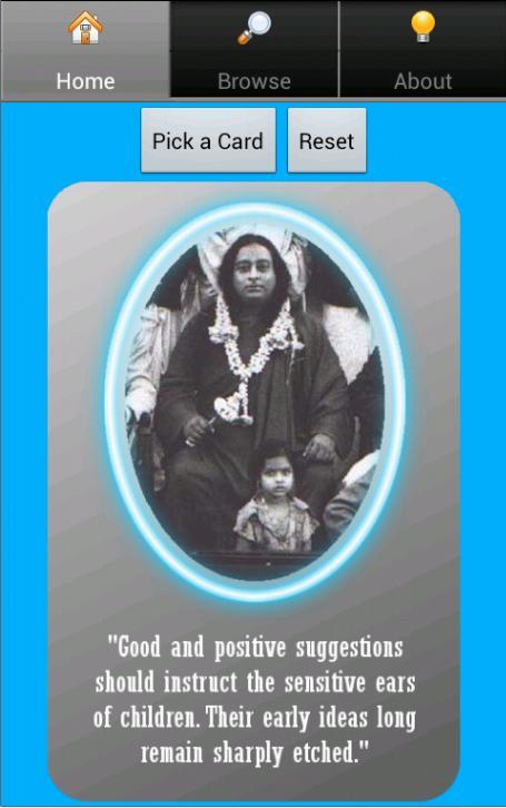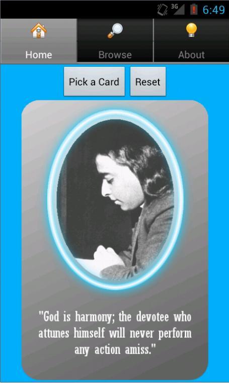 The cards also acts as Oracle cards. Whenever in need of guidance from the great Gurus, pray mentally and then click on "Pick a card" which picks a card randomly from the collection of cards. Take this as an answer and then start your day! Use it as often as you like.