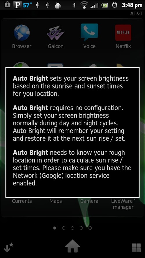 Auto Bright requires no configuration. Simply set your screen brightness normally during day and night cycles. Auto Bright will remember your setting and restore it at the next sun rise / set.