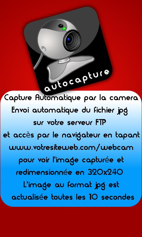 Click on "Start Capture" and the app take picture every x seconds, writing on the picture, makes a webcam directory, uploads index.html file with javascript, uploads the picture to the server FTP