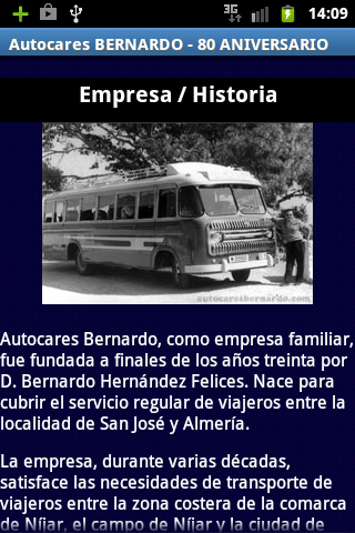 Esta aplicación para móvil y tabletas es una guía corporativa, para todos aquellos viajeros, clientes y proveedores que deseen conocer los servicios, empresa, equipamiento, localización, incluso la historia de Autocares Bernardo de Almería.