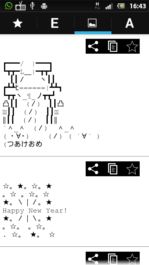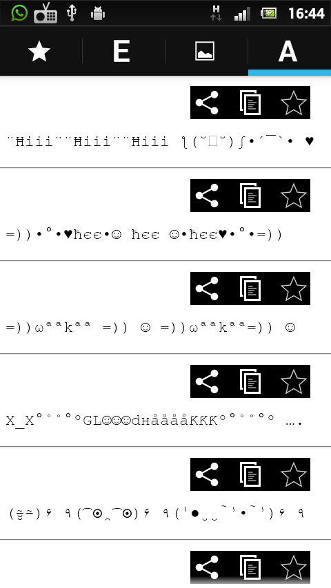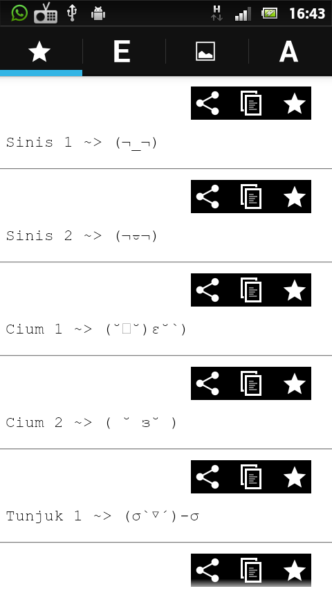 Juga ditambahkan fitur favorite, untuk menandai emoticon atau autotext yang sering kamu gunakan. Selain itu ada juga fitur share, sehingga anda bisa langsung membagikan emoji atau autotext ke aplikasi chatting kamu.