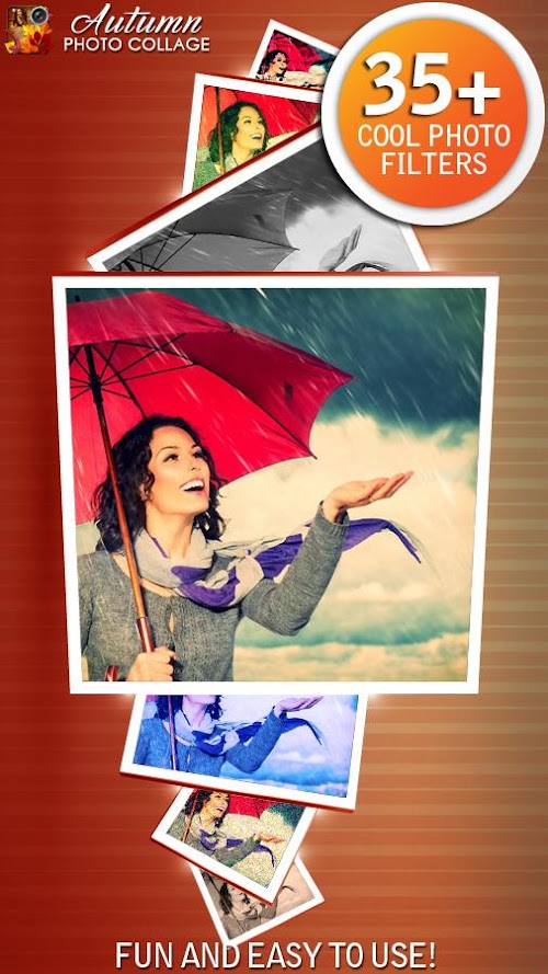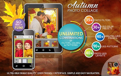 Don't you think that autumn is the most romantic season of the year?! Fascinating colors all around us! Amazing fiery red trees and leaves rustling beneath our feet make us fall in love with this enchanting season of the year. Check out this fabulous new app for Android™ phones and have lots of fun! Wait no more, be the first to have this magical “Autumn photo collage” maker and make beautiful autumn theme pictures for your phone! This awesome “FREE photo editor“ application is for everyone’s taste. If you are searching for “funny images” for your mobile phone background with lovely autumn decoration, this fall collage maker is perfect for you! Pic Collage app allows you to create amazing collages using your photos, stickers, text and frames. You will have an amazing pics art on your phone! Get ready for photo funia! Turn your pictures into a lot of fun by adding “Autumn photo frames” and effects! Perfect autumn photo grid is the best possible way to show off your romantic personality! These awesome photo effects bring you the most amazing photo frames and stickers to work with. Try awesome autumn app now and have fun! These funny photos are for those who enjoy going for long walks in the park while beautiful red and yellow autumn leaves rustle beneath their feet. This “free image editor” offers you square templates, polygon templates, circle templates, heart templates, star templates and more photo templates of different sizes and shapes. The beautiful Autumn Photo Collage maker for Android phone will be a unique gift for all your friends when you make amazing collages with their pictures! Use ☂Autumn Photo Collage Editor☂ app and create charming autumn photos by adding different templates and decoration. Just choose your photo from the photo gallery or take a new photo directly from your phone. You can move, stretch and zoom them around until they fit photo collage template. With free collage maker you can create unique pics art collage for your phone. With☂Autumn Photo Collage Editor☂ convert any image into an unforgettable memory with many “fall photo frames“ specially designed for you to have fun with. Share with your friends and family on Facebook, Twitter, Instagram and enjoy beautiful “cool collages“ on your phone! Brand new “collage maker” is waiting for you.