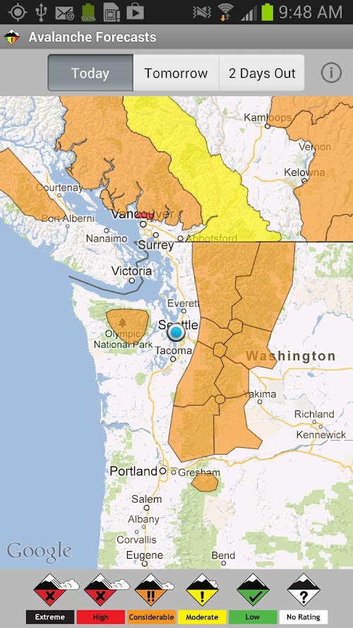 The easiest way to see current avalanche danger levels at-a-glance, for areas around you (see coverage information below).