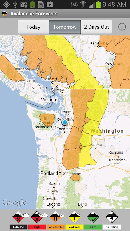 Bottom-line danger levels are shown color-coded for each forecast region on a map, based on the selected timeframe (Today/Tomorrow/2 Days Out). Click on any region to view the detailed avalanche forecast from the source forecasting center.
