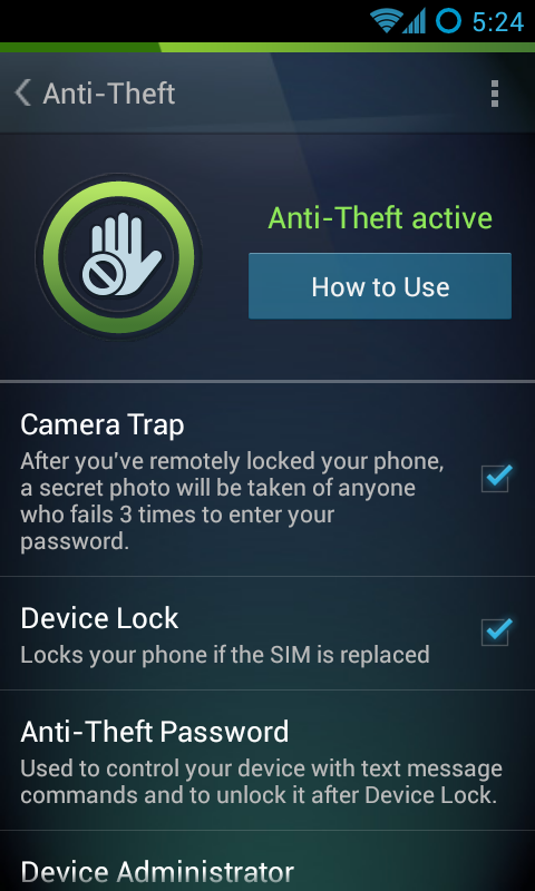 Anti-Theft & Phone Location: (using AVG’s remote console or text messages (SMS; for SIM supported devices))