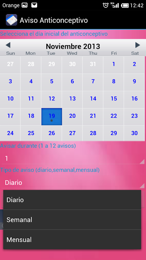 Con aviso anticonceptivo únicamente tendrás que configurar si el periodo de cambio es diario, semanal o mensual y crear los avisos (de 1 a 12 avisos).