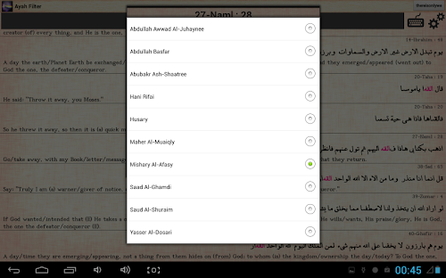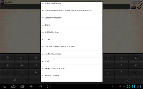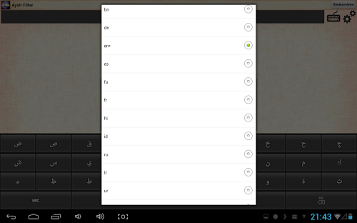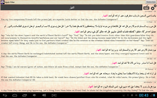 Ayah Filter displays ayat containing the search words you enter on the screen (together with their translations in your own language). You may also get Quranic word suggestions for your input in the following languages: Albanian, Arabic, Bengali, Chinese, English, French, German, Hindi, Indonesian, Spanish, Persian, Russian, Turkish, Urdu. Clicking on any suggestion will show you the word's usage throughout Quran.
