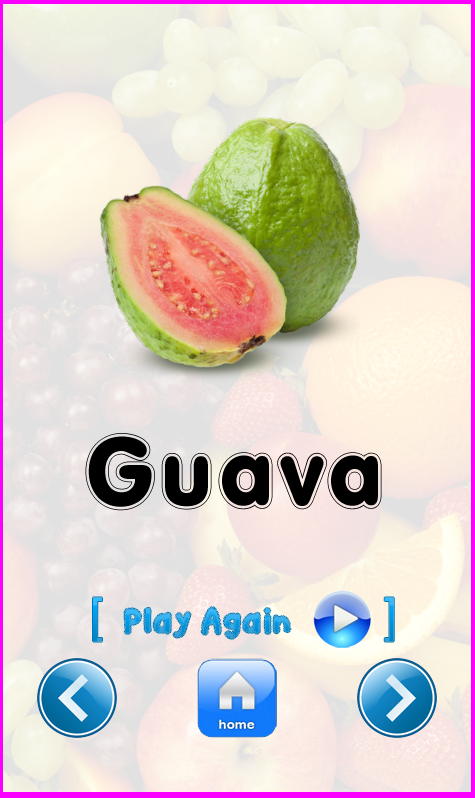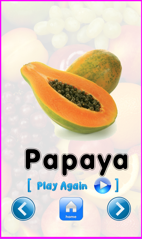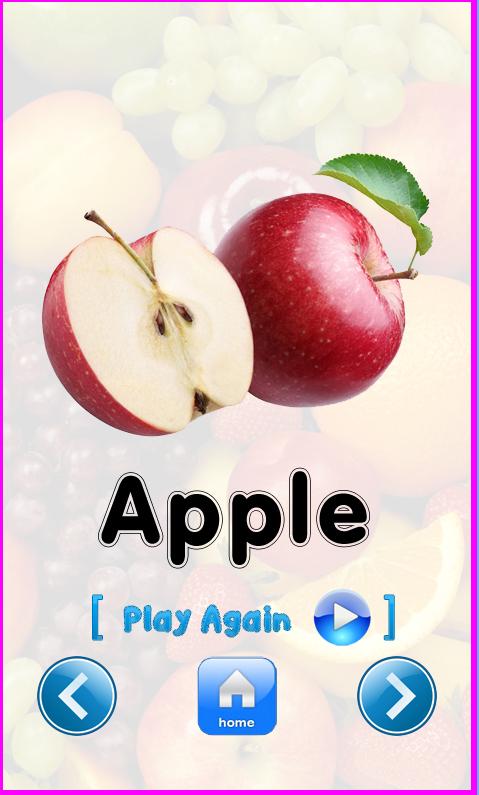 The Baby Learning Card Fruit (Learn Fruits Name) support a modes which Need your baby touch the screen and play himself, click the replay button on the phone will play the sound again.