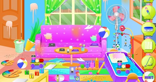 After playing the house is very dirty! Help mommy cleaning the room. It’s dusty and a mess! Clean up the mess, dust, vacuuming and cleaning. When the living room is cleaned and tidy the kids need a bath!