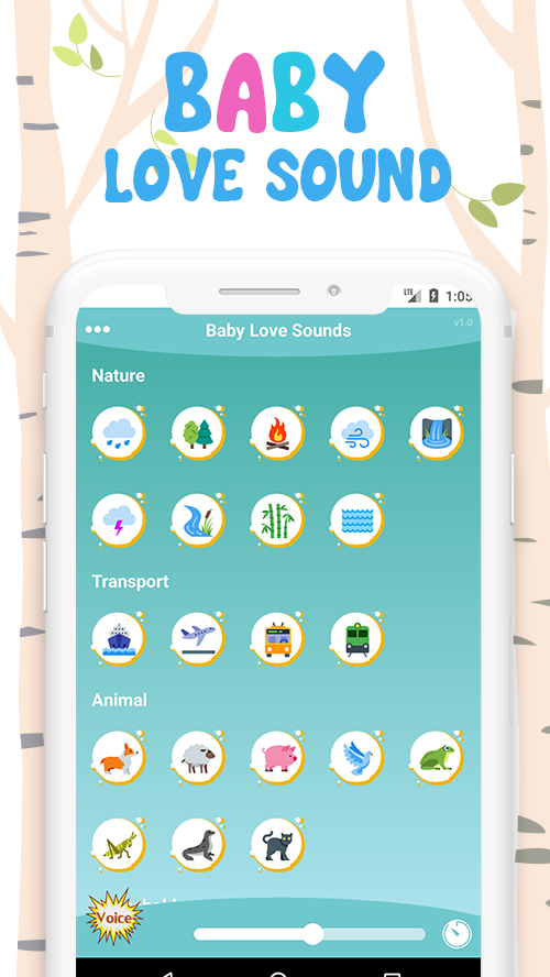 ★ Rain ★ Forest ★ Ocean ★ Wind ★ River ★ Night ★ Fire ★ Heart ★ Car ★ Train ★ Plane ★ Washing machine ★ Vacuum cleaner ★ Clock ★ Fan ★ Radio ★ Hair dryer ★ Shower ★ White Noise ★ Brown Noise ★ Pink Noise ★ 4 gentle lullabies