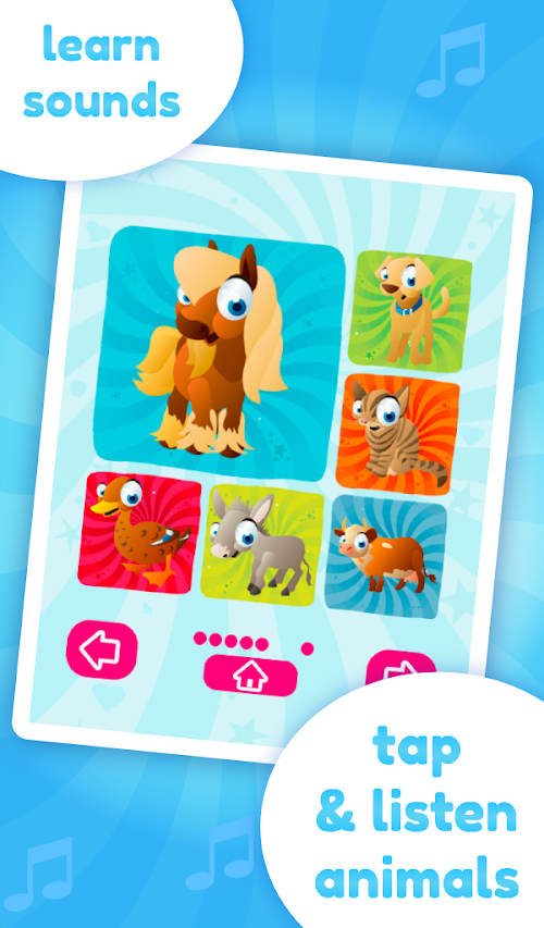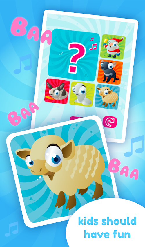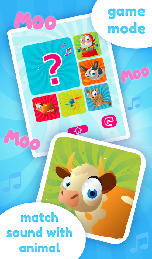Baby Sounds Game is an educational application for your child to play and learn about animal and other sounds. Teach your baby or toddler to recognize different characters and connect them with related sounds. The application is childproof, which means your device will be set into a lock mode to avoid exiting from the game during the play. The app allows two playing modes: SOUNDS and GAME.
