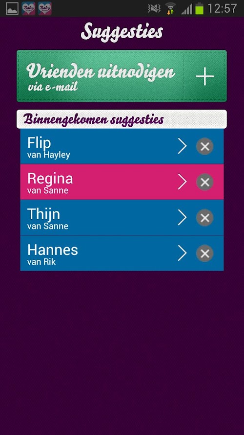 Looking for even more inspiration? Or curious about what names your friends to find your child fit? Invite your friends over from the app and ask them to send a name. This will consist of a push notification to you inside, so you (if you like the names) can add to your favorites.