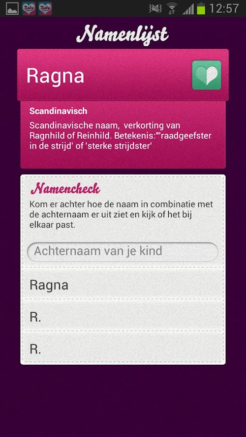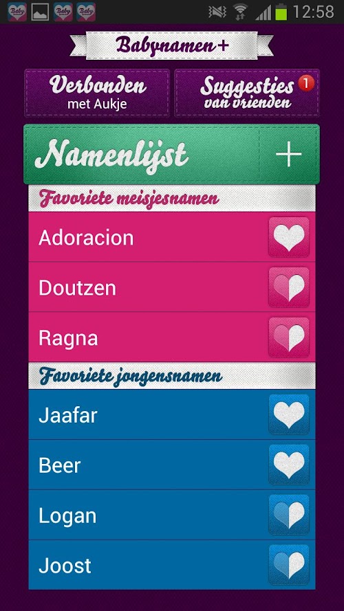 Unique: install the app even on the phone (iPhone or Android) to your partner and hold together with a favorite list. See what names your partner likes and what names you both like. So you come along to the best name for your child!