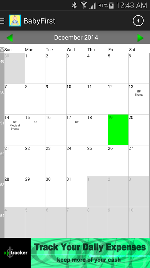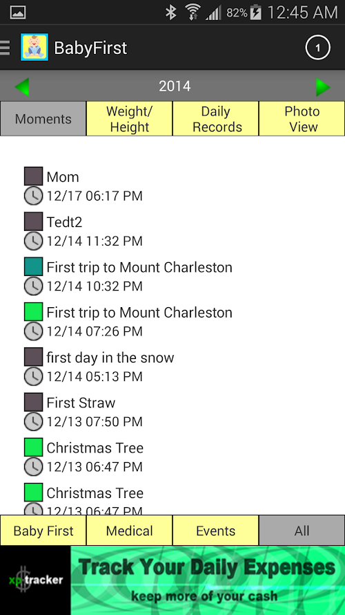You can configure Baby’ First Moments to remind you to enter events for that day. What good is a tracking program if you forget to enter what happened that day, because of your busy schedule. Just go to the Setting page and select "Reminder Notification". After you turn it on, you can select the days of the week you want to be reminded. You can even tap on the "Reminder Time:" to choose the time of the day you want to be reminded. It is that simple.