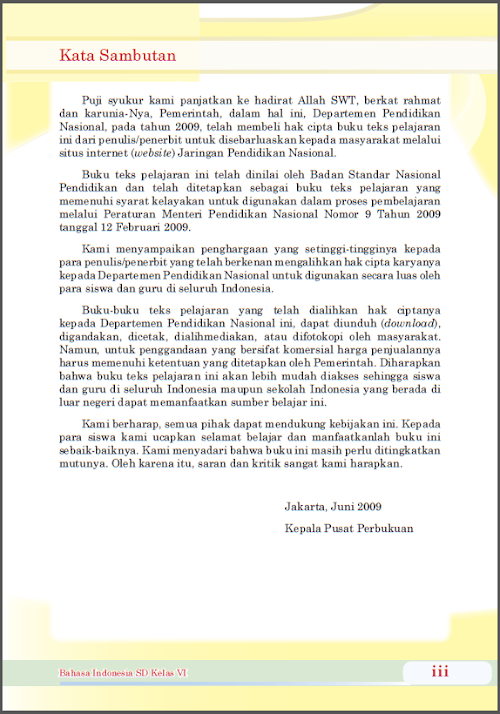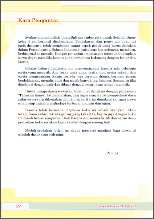 Syukur alhamdulillah, buku Bahasa Indonesia untuk Sekolah Dasar kelas 6 ini berhasil diselesaikan. Pendekatan dan penyajian buku ini pada dasarnya telah membahas empat aspek pokok yang harus diajukan dalam Pembelajaran Bahasa Indonesia, yaitu aspek mendengar, membaca, berbicara, dan menulis. Dengan penyajian empat aspek tersebut diharapkan siswa dapat memiliki kemampuan berbahasa Indonesia dengan benar dan lancar.