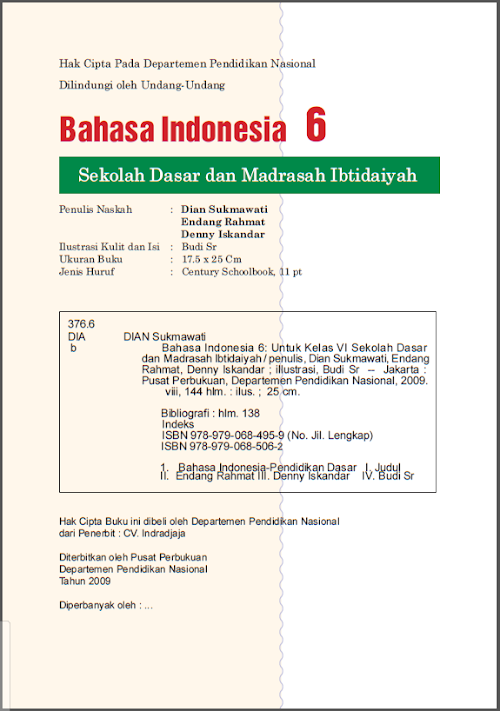 Mudah-mudahan buku ini dapat memberi manfaat bagi siswa di sekolah dasar atau sederajat.Thank God, Indonesian books for Elementary School 6th grade is successfully completed. Approach and presentation of this book basically has discussed four key aspects that must be filed in Learning Indonesian, ie aspects of listening, reading, speaking, and writing. With the presentation of the four aspects of students are expected to have the ability to speak Indonesian correctly and smoothly.