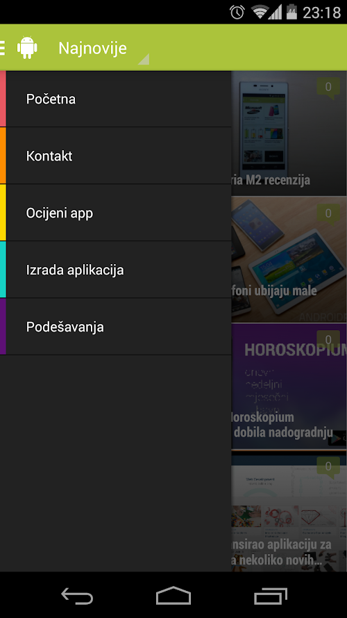 + U kategorijama - povlačenjem prsta od lijeve ivice ka desnoj, otvara se meni sa dodatnim opcijama.