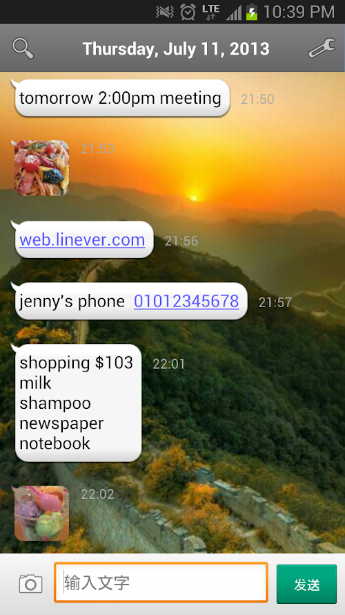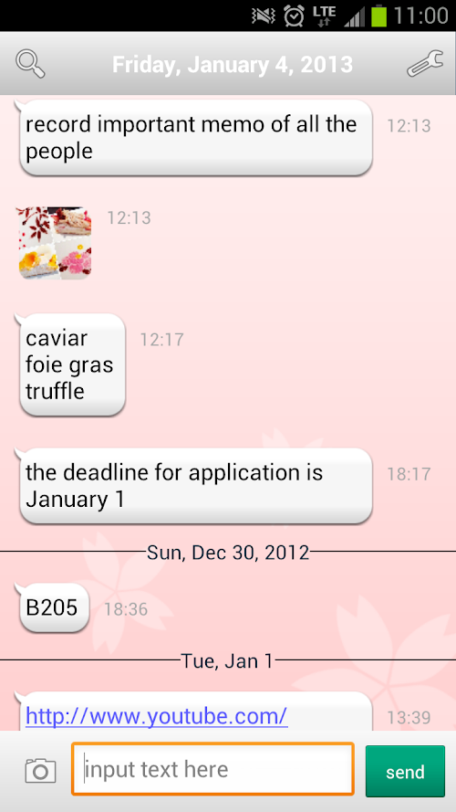 This is a memo pad app for taking memos with text and images just like the text messenger you are accustomed to(like WhatsApp,Tango, LINE, Viber, Kik, Facebook, kakao, WeChat).