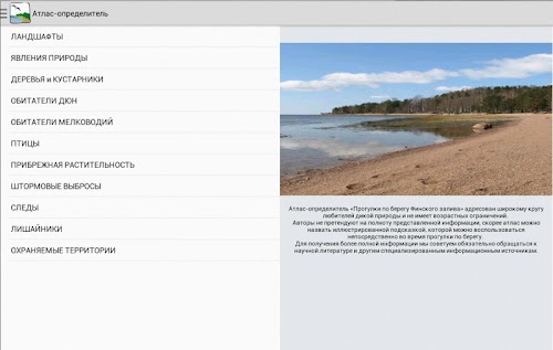 Атлас-определитель адресован всем любителям дикой природы. Фотографии и короткие описания помогут опознать типичных обитателей песчаных дюн, тростниковых зарослей и каменистых мелководий. Отдельный раздел посвящен особо охраняемым природным территориям побережья. Программа поможет родителям ответить на вопросы любознательных детей непосредственно во время прогулки по побережью залива.Field guide is addressed to all lovers of wildlife. Photos and short description to help identify the typical inhabitants of the sand dunes, reeds and rocky shoals. A separate section is devoted to the Protected Areas coast. The program will help parents answer the questions of curious children directly while walking along the coast of the Gulf.