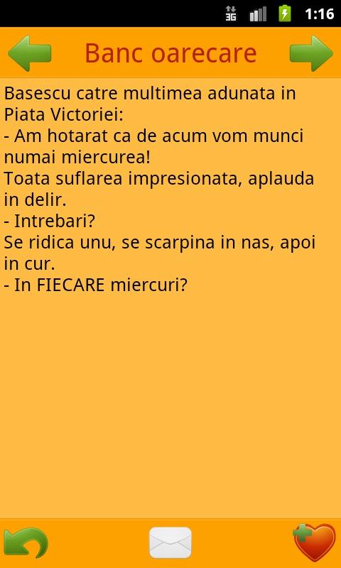 Poți adăuga bancurile proprii, le poți împărtăși cu alții și le poți trmite prin email sau mesaj text. Mii de bancuri gratuite în 19 de categorii. Distracție plăcută! Nu este nevoie de conectare la internet!