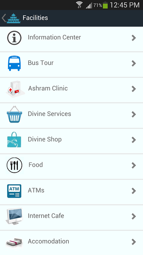 Details of various facilities and amenities at the ashram such as emergency clinic, stores, food locations, health and wellness center, divine shops, ATMs, locker room and much more.
