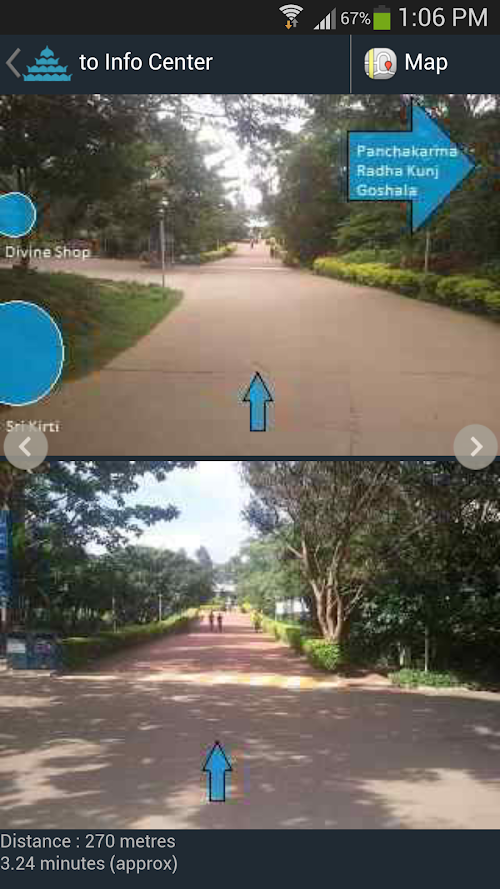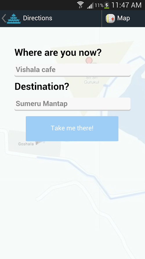 Enter the source and destination and the app will guide you through the ashram.(Note: This functionality only works at Bangalore ashram)