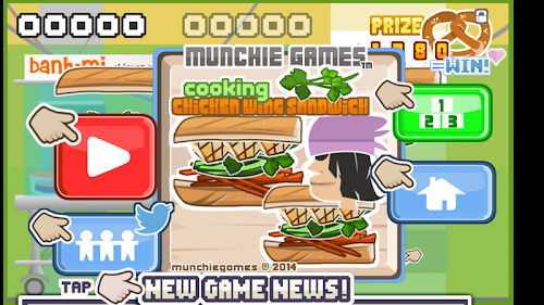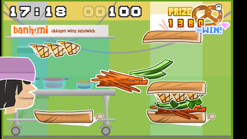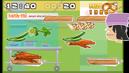 Cooking Chicken wing sandwiches with fresh vegetables and grilled spicy chicken wings is fun and easy. In this cooking game, you just launch the fresh french bread into the air and make sure you hit the correct sandwich fillings in order! Make sure to get the pickled carrots, fresh cucumber slices, grilled chicken wing skewers and the the fresh cilantro and top bun! Making Bahn Bi is quite easy and healthy! If you're real fast you can win the 3 Bahn be virtual coin achievements! Scoring that high can be difficult so good luck! This is the ultimate Vietnamese street food treat..you might get very hungry playing this game!