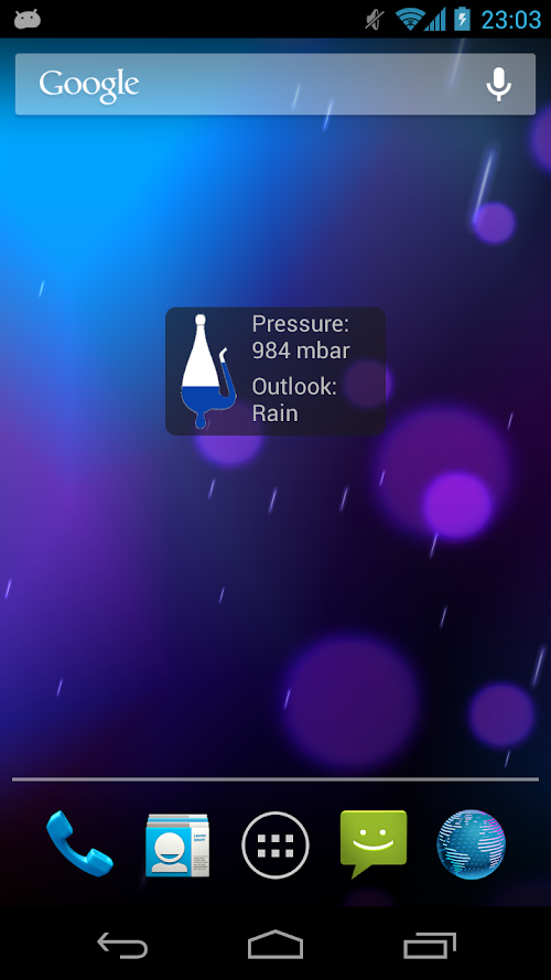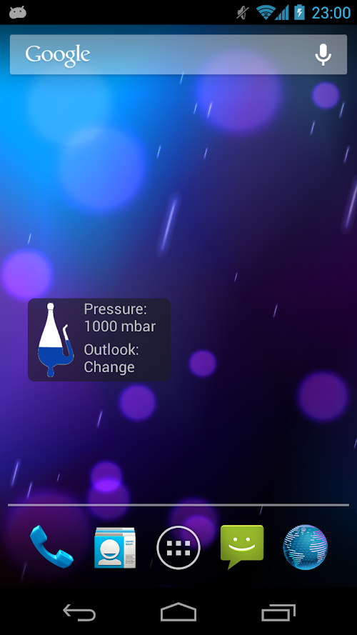 This widget uses the internal barometer of the phone and shows you the current air pressure. In addition, it tells you the outlook and how the weather is going to change. Usually low pressure means the weather is getting worse and high pressure means the weather will be good.
