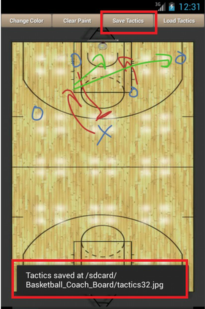Also includes the ability to save the Basketball tactics image on location "sdcard/BasketballCoachBoard" and load the Basketball tactics image to gallery.