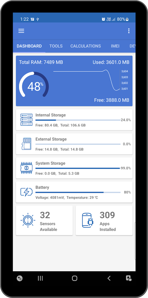 Check hardware and software system info like hw monitor(Hardware Monitor) and check whether your cell phones operating system is up to date considering types of operating system and computer systems technology which is helpful to manage device settings. Device Info App is to check computer systems technology and mobile phone or any android cellular phone software and hardware info along with awesome dashboard which shows realtime RAM status and RAM usage graph along with following statistics: