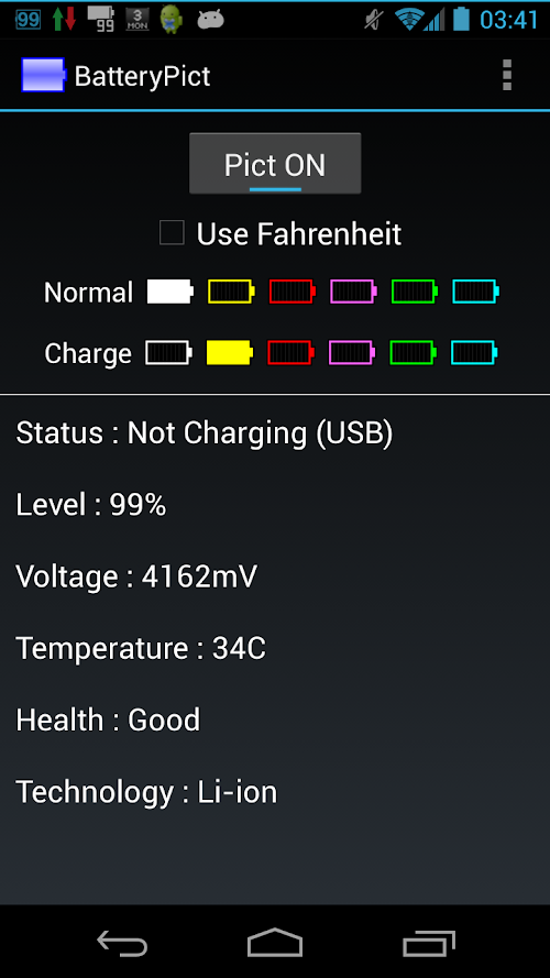 BatteryPict shows the battery level and related information in the notification bar.