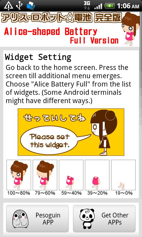This application is a widget for your home screen and you can enjoy personalization of it. Keep pressing the home screen till an additional menu of widgets appears. Pick out “Alice Battery” from a list of widgets.