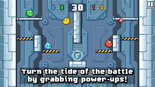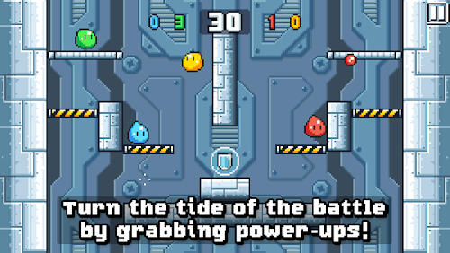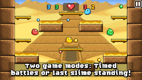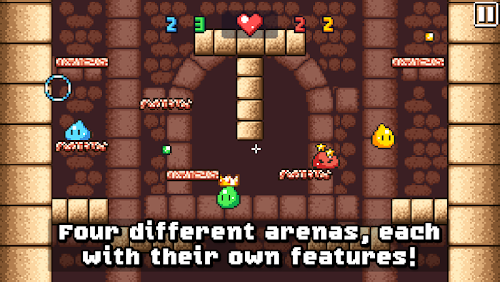 This platformer/shooter game features simple one-button jump controls. Play against the computer or up to four friends in matches. Choose from two different game modes and four different battle arenas. Pick power-ups to turn the tide of the battle! Who will be the last slime standing?