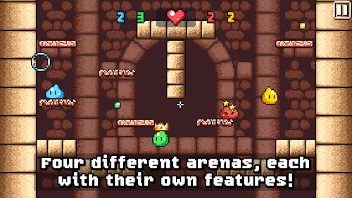 This platformer/shooter game features simple one-button jump controls. Play against the computer or up to four friends in matches. Choose from two different game modes and four different battle arenas. Pick power-ups to turn the tide of the battle! Who will be the last slime standing?