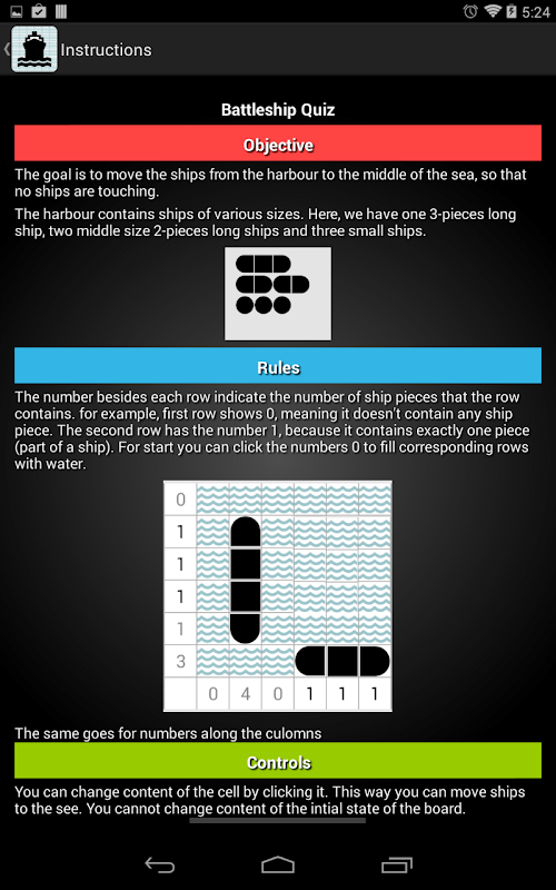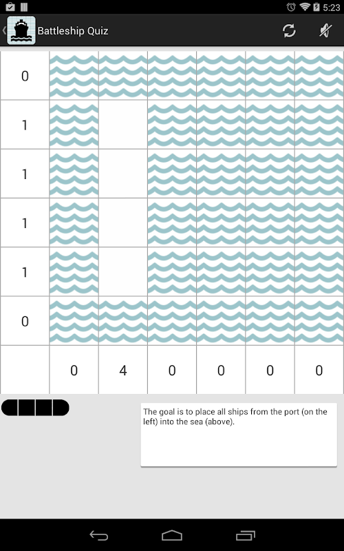 Your goal is to place a fleet of battleships in the sea so that ships don't touch each other.