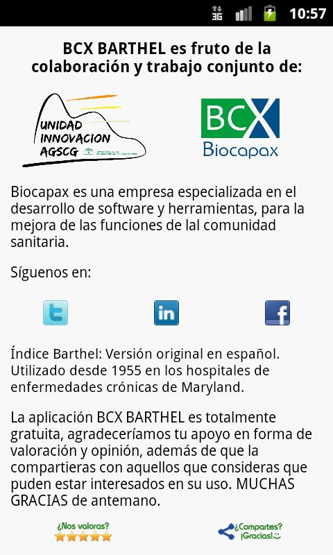 IMPORTANTE: BCX Barthel es una aplicación pensada para su utilización por personal sanitario, cuidadores y familia. Cualquier mal uso o uso inadecuado de ella no es responsabilidad de los creadores. El profesional siempre deberá verificar la corrección de la valoración generada por la aplicación que es meramente orientativa y basada en el índice original.