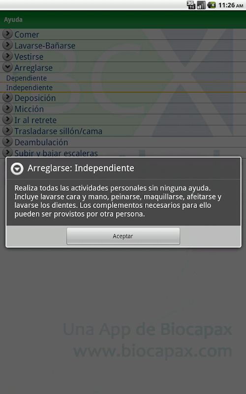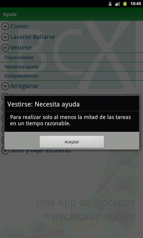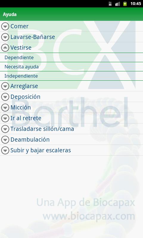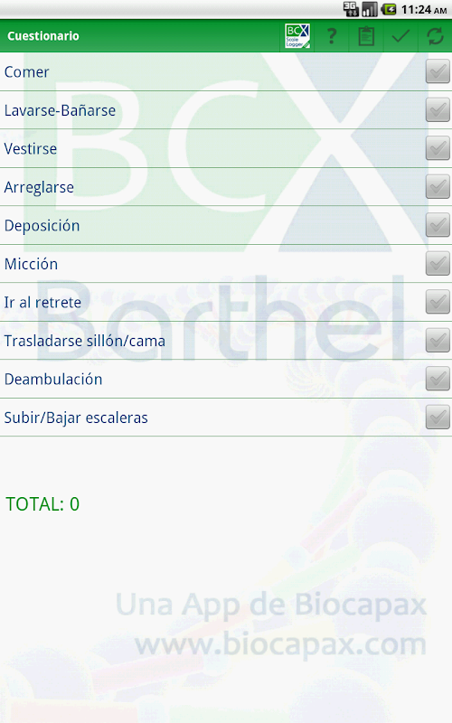 o visita http://www.biocapax.comBarthel BCX is an application designed for use as a daily activity support of health professionals, and family caregivers who want to assess the patient's level of independence with respect to the implementation of some basic activities of daily living, through rapid consultation and safe Barthel risk assessment scale used in Maryland since 1955