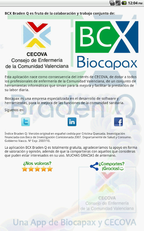 IMPORTANTE: BCX Braden Q es una aplicación pensada para su utilización por personal sanitario, cualquier mal uso o uso inadecuado de ella no es responsabilidad de los creadores. El profesional siempre deberá verificar la corrección de la valoración generada por la aplicación que es meramente orientativa y basada en la escala original.