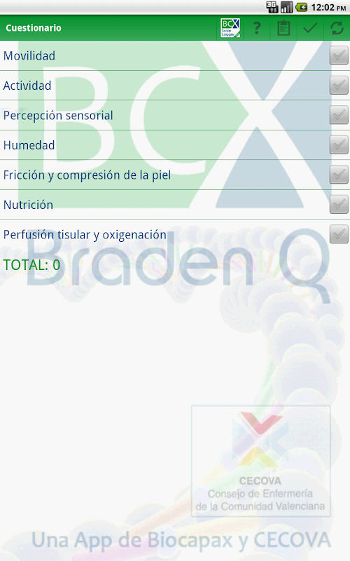 IMPORTANT: BCX Braden Q is an application designed for use by medical personnel, any misuse or improper use of it is not the responsibility of the creators. The professional should always verify the correctness of the assessment generated by the application that is merely illustrative and based on the original scale.