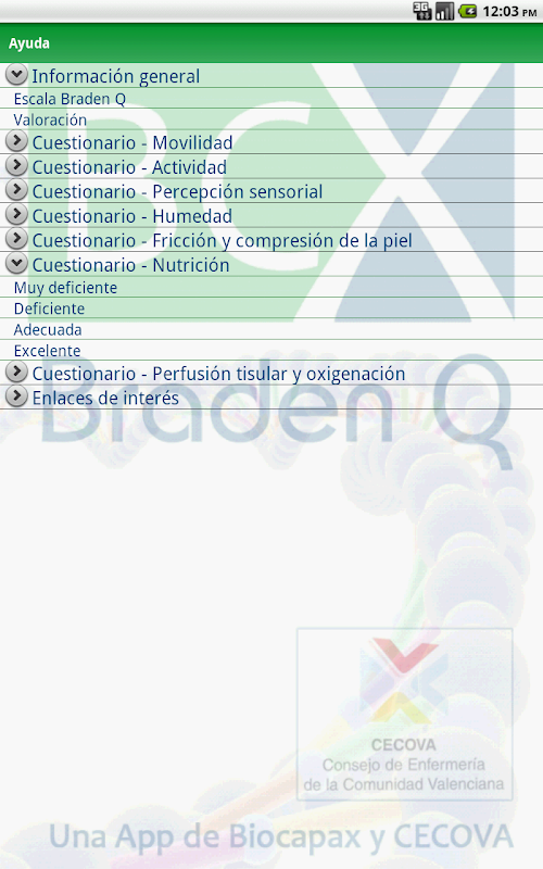 BCX Braden Q es una aplicación pensada para su uso como apoyo a la actividad diaria de los profesionales sanitarios interesados en la prevención y tratamiento de las lesiones por presión en niños, mediante la consulta rápida y segura de la escala de valoración riesgo Braden Q (Copyright Quigley, S., & Curley, M. A. Q. (1996) All rights reserved)